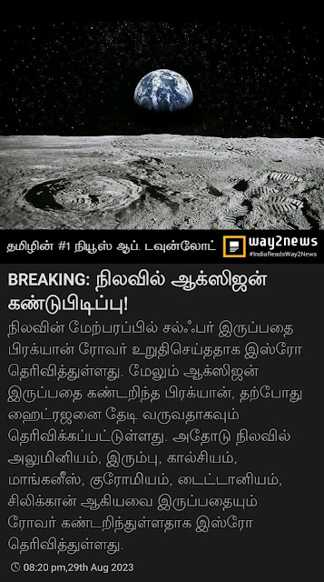 நிலவின் தென்துருவத்தில் சந்திரயான் 3யின் விக்ரம் லேண்டர் மற்றும் ரோவர் உள்ளிட்டவை ஆய்வு மேற்கொண்டு வருகின்றன. அந்த வகையில் நிலவில் ஆக்சிஜன், சல்பர், அலுமினியம், கால்சியம், குரோமியம், சிலிக்கான் உள்பட பல தனிமங்கள் இருப்பதை ரோவர் உறுதி செய்துள்ளதாக இஸ்ரோ முக்கிய தகவலை தெரிவித்துள்ளதால் உலக நாடுகள் வியந்துபோய் இந்தியாவை திரும்பி பார்க்கின்றன.