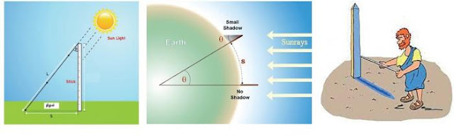 இப்போது எரட்டோஸ்தனிஸ் கதைக்கு வருவோம். ஒவ்வோர் ஆண்டும் ஜூன் 21 அன்று சைன் நகரின் கிணறுகளில் நண்பகலில் செங்குத்தான பொருட்களின் நிழல் தரையில் விழவில்லை என்று படித்தபோது, அதேநேரத்தில் அலெக்சாண்ட்ரியா நகரில் அதுபோல் நிழல் இல்லாமல் இருக்கிறதா என்று பார்த்தார். ஆனால், அலெக்சாண்ட்ரியாவில் அதே நாளில் நண்பகலில் செங்குத்தாக இருக்கும் கோபுரங்களில் நிழல் தரையில் விழுவதைக் கண்டார்.